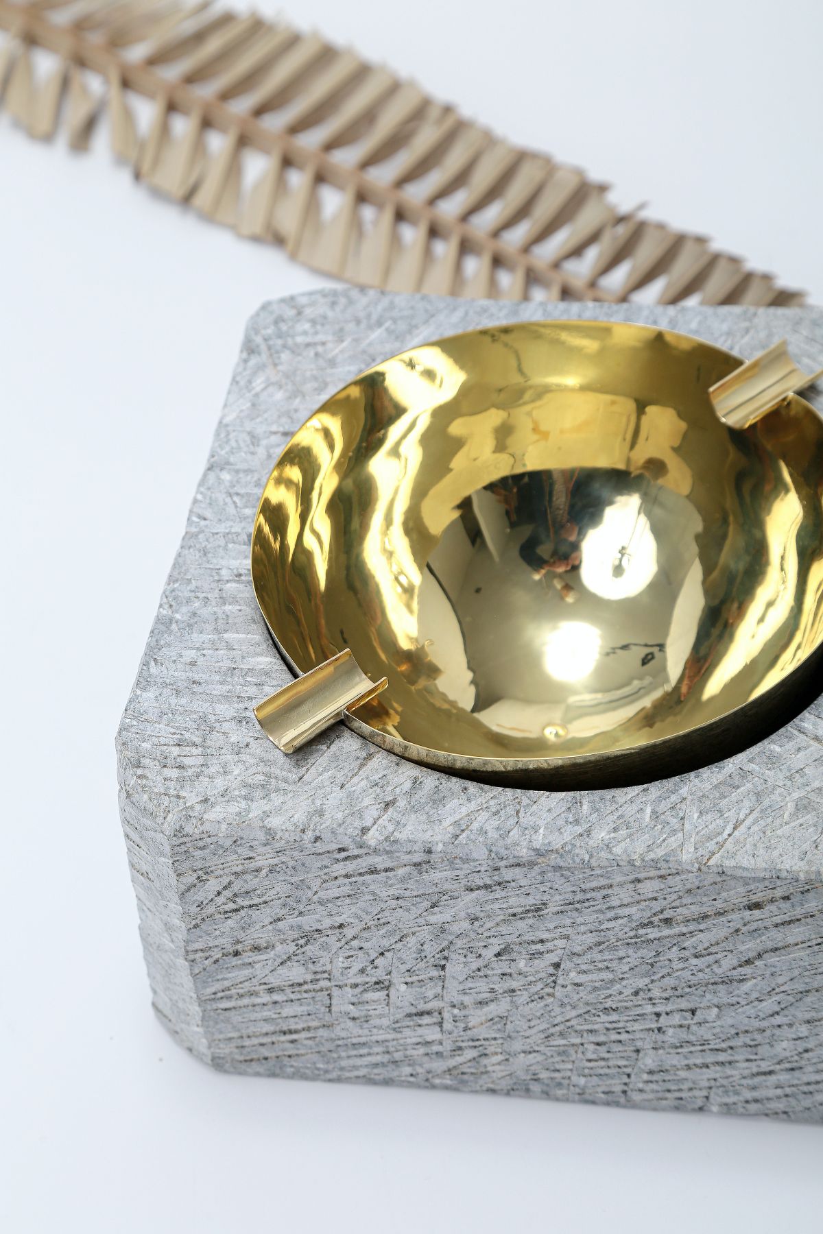 Descrição: Cinzeiro em pedra-sabão com recipiente em latão polido. A base esculpida, com textura marcada, contrasta com o brilho do metal, resultando em uma peça funcional e contemporânea que adiciona sofisticação a qualquer composição.