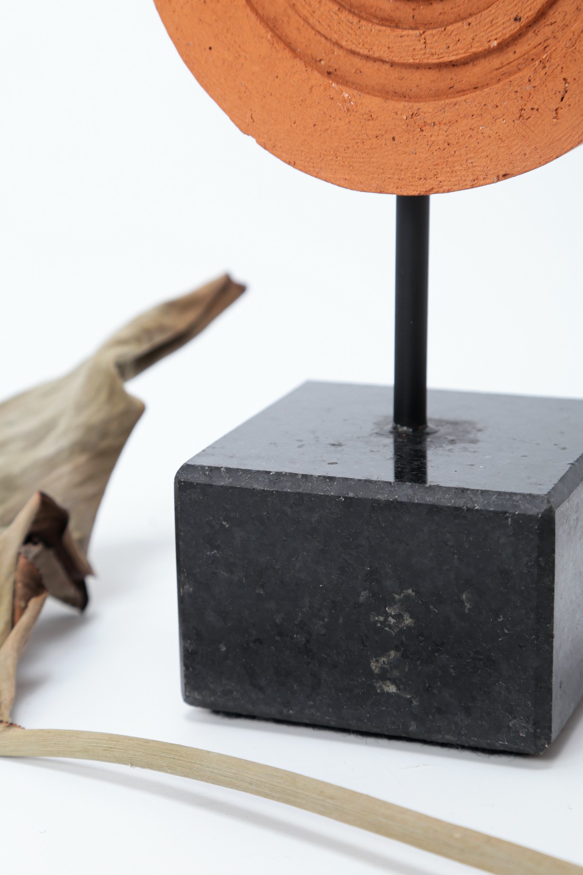 Descrição: Escultura em cerâmica que explora as características naturais da matéria prima, se aprofundando na textura e contraste com o granito.