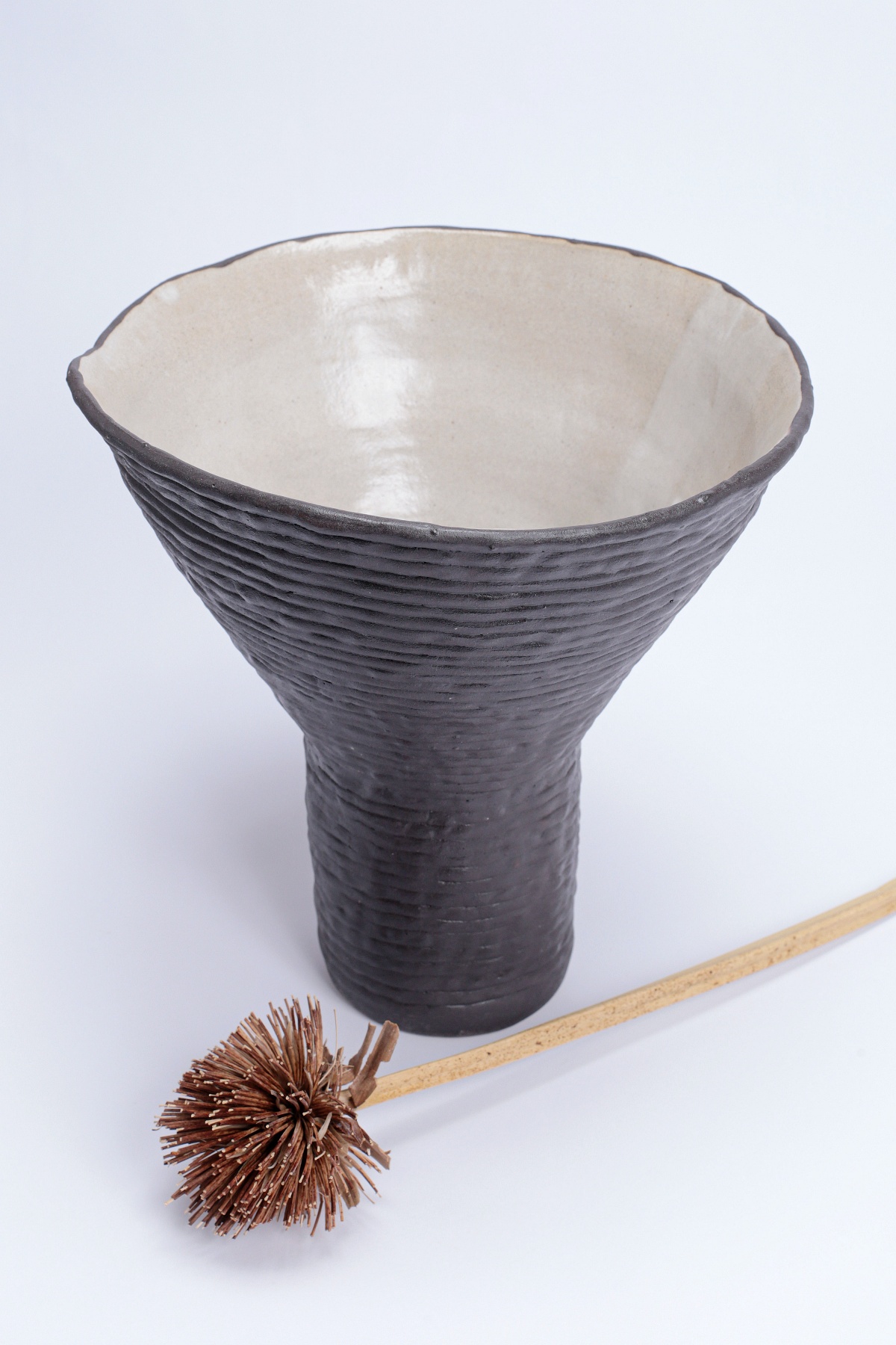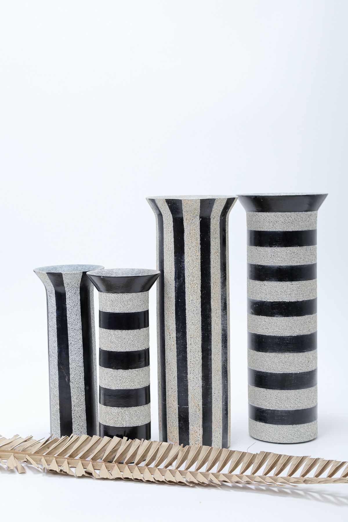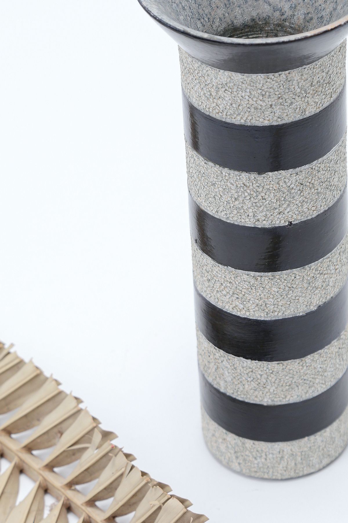 Descrição: Vaso Lis em pedra-sabão com laterais em padrão listrado. A textura natural da pedra e o contraste das faixas criam uma peça discreta, funcional e com presença contemporânea.