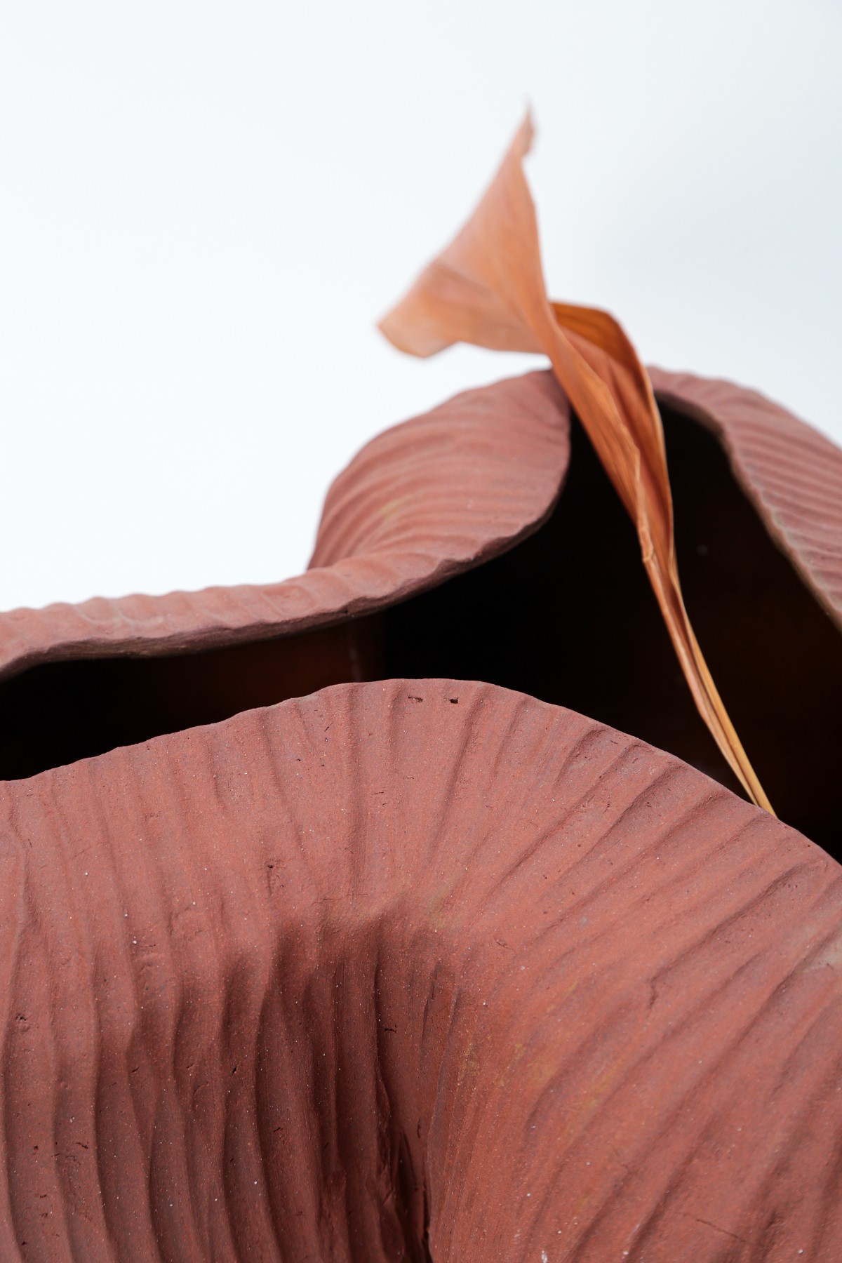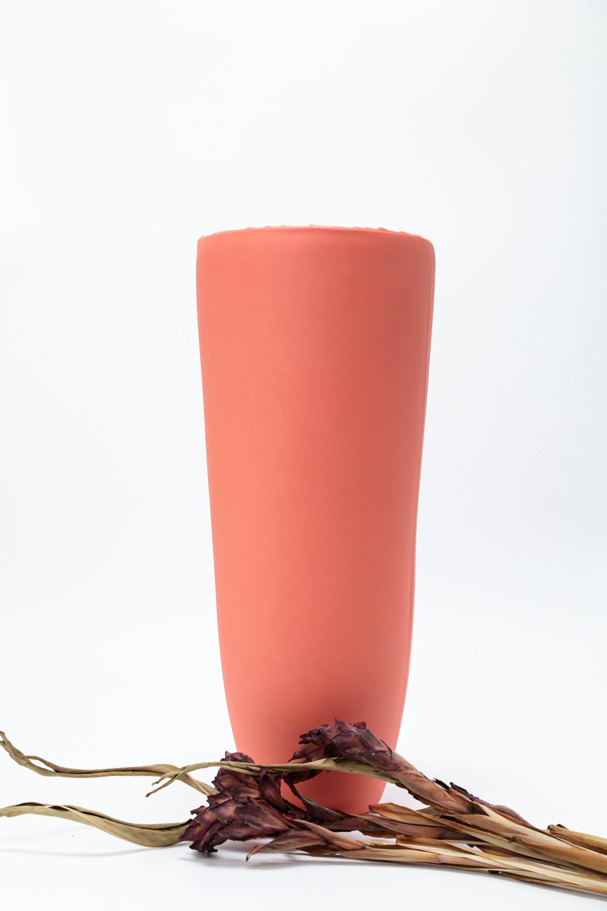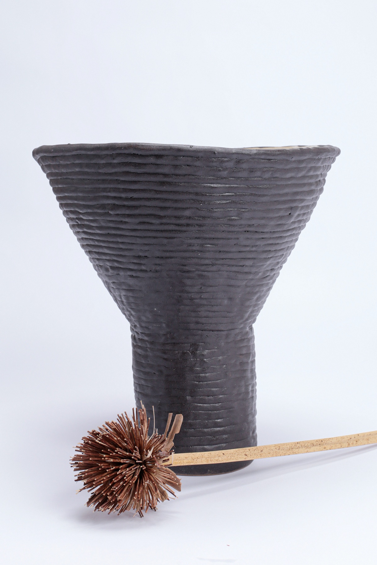 Descrição: Vaso Lis em pedra-sabão com laterais em padrão listrado. A textura natural da pedra e o contraste das faixas criam uma peça discreta, funcional e com presença contemporânea.